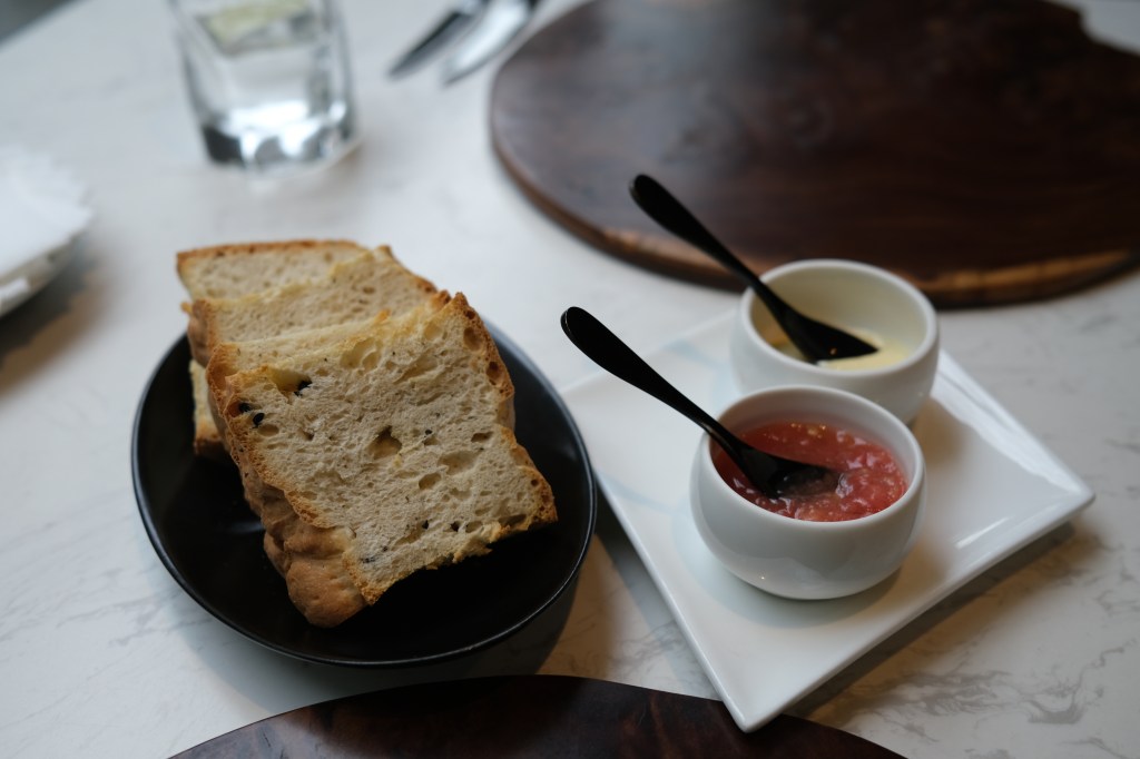 麵包是餐廳手工製作,搭配了迷迭香和黑橄欖香氣十足,一上桌熱熱酥酥的搭配大蒜美乃滋及牛番茄醬,非常好吃!後來還忍不住再續了一盤,要不是之後還有很多菜,我可能會再無限續下去XD