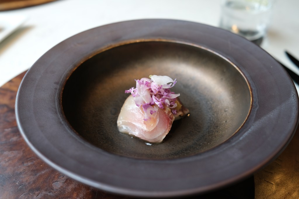 使用東港的紅甘,魚肉非常鮮甜,上頭搭配刨成薄片的紫色花椰菜,魚肉下方不是普通的白飯喔!是皎白筍,很出乎意料的組合,醬料是蘋果醬和水蜜桃冰沙,酸酸甜甜的作為開胃菜再適合不過了~