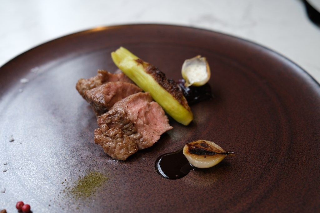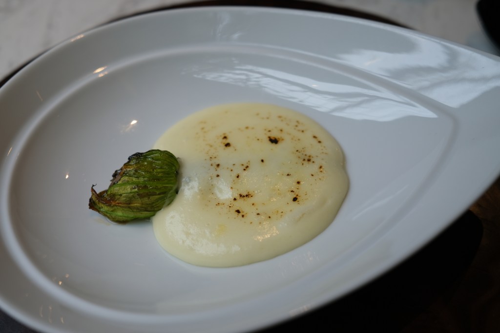結果吃起來很不錯,非常綿密細緻的馬鈴薯泥帶著松露的香氣,櫛瓜花本以為只是單純櫛瓜,沒想道裡頭居然鑲了肉末,超級多汁!算是這道的一大亮點。