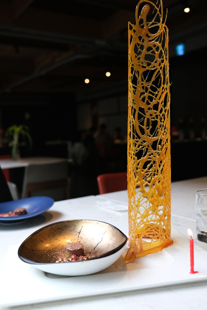 另一道甜點是巧克力蛋糕搭配上莓果醬白玉,說實話對甜點本人的印象都在那個超高的糖塔上的,只要訂餐時有跟餐廳告知生日就會準備喔!端上來拍照很漂亮,但吃起來就真的只是在吃糖,沒什麼太特別之處。